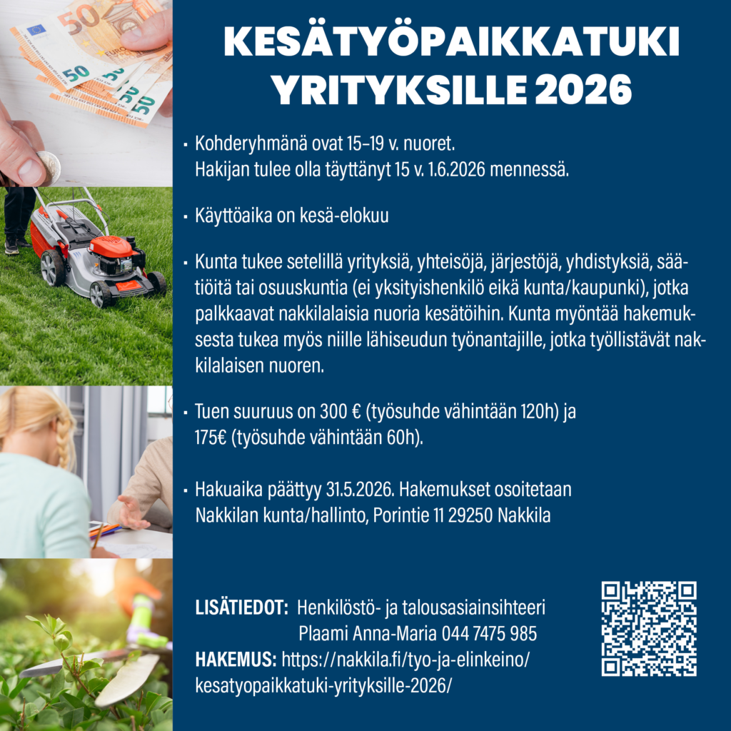 Nakkilan kunta tarjoaa tänä vuonna upeita kesätyömahdollisuuksia nakkilalaisille nuorille 7. luokasta alkaen. Kunta työllistää nuoria eripituisiin työsuhteisiin ja monipuolisiin työtehtäviin kunnan eri hallintokunnissa. Kesätyöt tarjoavat oivan mahdollisuuden tutustua eri ammatteihin ja työelämään. Usein kesätöistä jää aikuisuuteen asti kantavat kivat muistot.